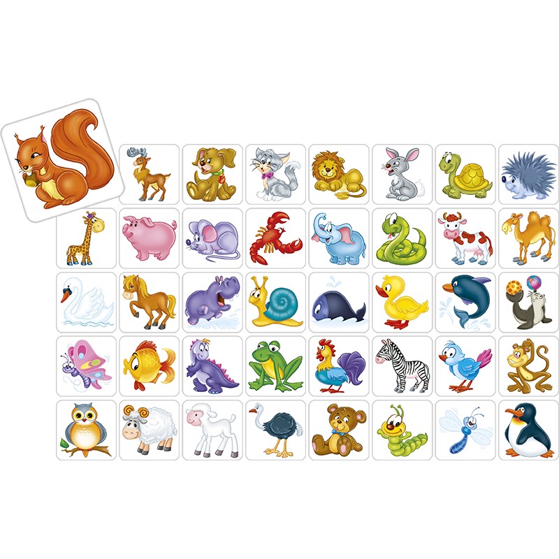 80 kartoników pogrupowanych w pary, mające na jednej stronie takie same obrazki w parze. Jest więc 40 par i 40 obrazków przedstawiających zabawne zwierzątka.