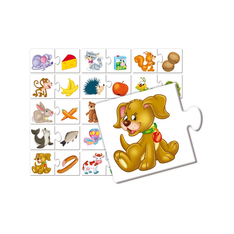 ZWIERZAKI I ICH PRZYSMAKI - Zestaw zawiera 24 puzzle, z których można ułożyć 12 obrazków przedstawiających zwierzęta i ich przysmaki.