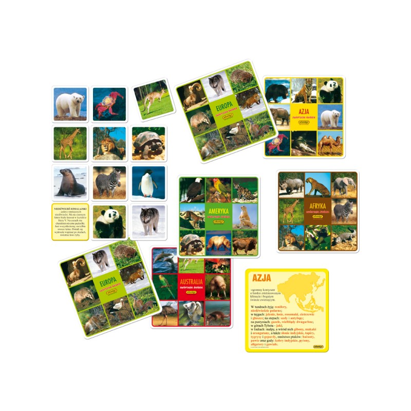 Witamy w krainie zwierząt. Spotkasz tutaj pandę, lwa i wiele, wiele innych przedstawicieli świata fauny. „Zwierzęta świata” to pouczająca loteryjka przyrodnicza, która poszerza wiedzę młodego człowieka na temat otaczającego go świata. W skład loteryjki wchodzi: 6 różnych plansz-kontynentów, 54 twarde, dwustronne kartoniki, na których widnieją rzeczywiste zdjęcia zwierząt.