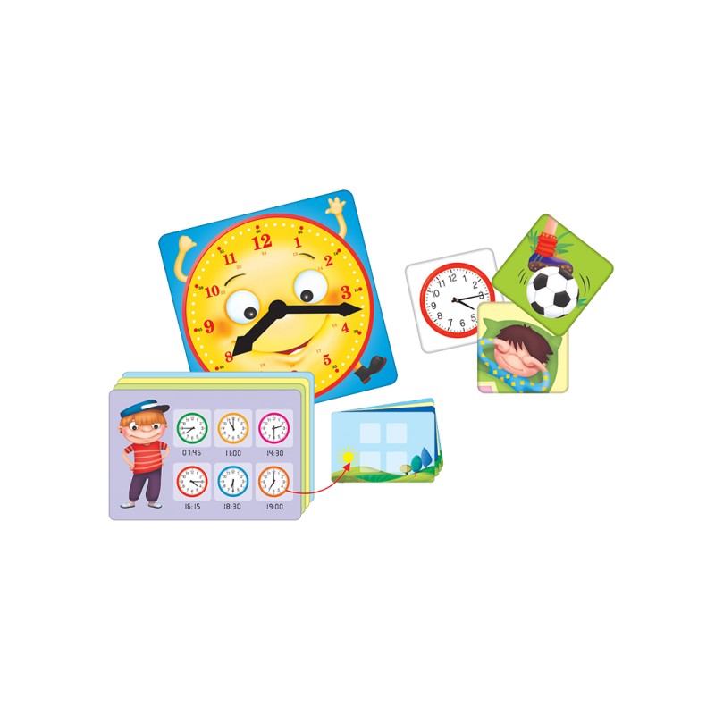 "Mój zegar" to ciekawa oraz mądra gra zarówno dla małych, jak i większych miłośników dobrej zabawy. Kolorowe, interesujące plansze i tafelki oraz duży zegar z ruchomymi wskazówkami pokazują, jak przyporządkować różne czynności do odpowiednich pór dnia.