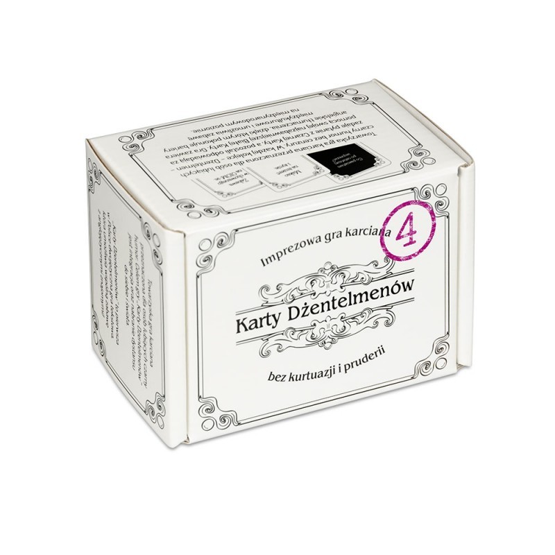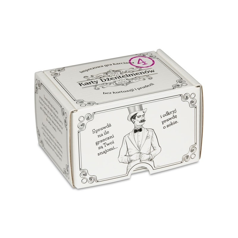 Karty Dżentelmenów: Epizod Czwarty to czwarta część imprezowej gra towarzyskiej z ogromną dawką czarnego humoru. Dżentelmeńskie rozgrywki z pewnością urozmaicą każde spotkanie w gronie błyskotliwych i obdarzonych niebywałym poczuciem humoru osób.