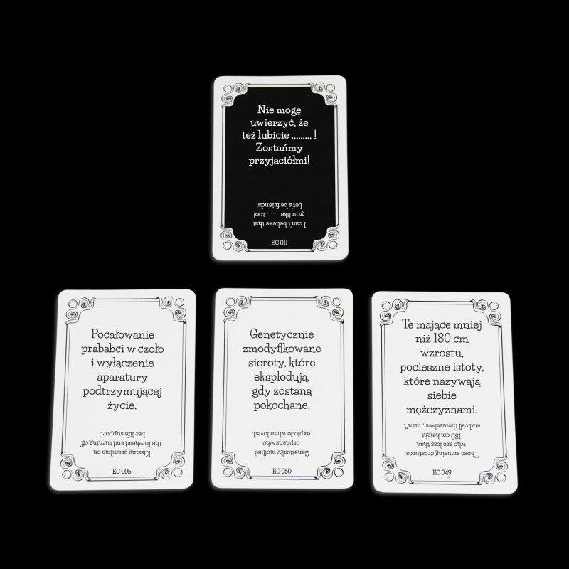 Jako jedyna na polskim rynku gra karciana zawiera anglojęzyczne odpowiedniki pytań i odpowiedzi, dzięki którym pokonuje bariery międzykulturowe i umożliwia zabawę na międzynarodowym poziomie.