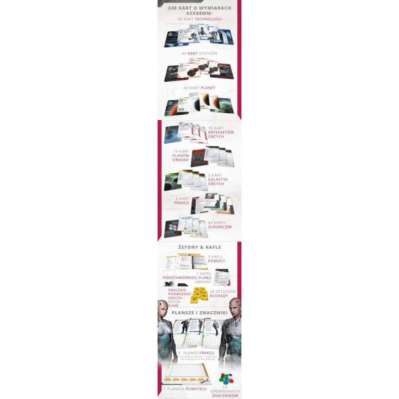 Artefakty Obcych dostarczają wrażeń pełnoprawnej gry 4x w mniej niż godzinę. Z ponad dwoma setkami kart i sześcioma grywalnymi frakcjami gra zapewnia multum możliwych strategii rozgrywki i zbierania punktów. Oferuje też ogromną regrywalność!