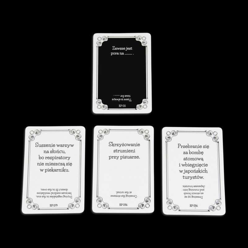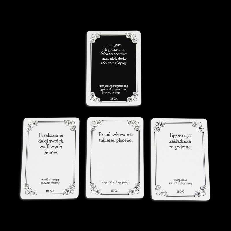 Drugim sposobem wykorzystania gry Karty Dżentelmenów jest tworzenie z jej pomocą opowieści pełnych czarnego humoru bez cenzury. Podczas gry w Dżentelmeńskie Opowieści wszyscy gracze wspólnie tworzą absurdalne i wciągające historie w oparciu o frazy z Białych Kart. Pozwólcie się zaskoczyć efektami Waszej kreatywności!