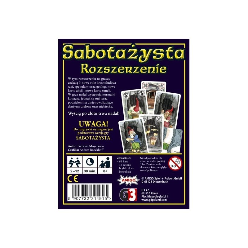 W tym rozszerzeniu, na graczy czekają 3 nowe role krasnoludów: szef, spekulant oraz geolog, nowe karty akcji i nowe karty tuneli. W grze nadal występują normalni kopacze, jednak są oni teraz podzieleni na dwie rywalizujące drużyny: zieloną oraz niebieską. Sabotażysta Rozszerzenie jest obowiązkową pozycją dla wszelkich miłośników doskonałej gry o poszukiwaniu bryłek złota. W tym dodatku każdy znajdzie coś dla siebie!