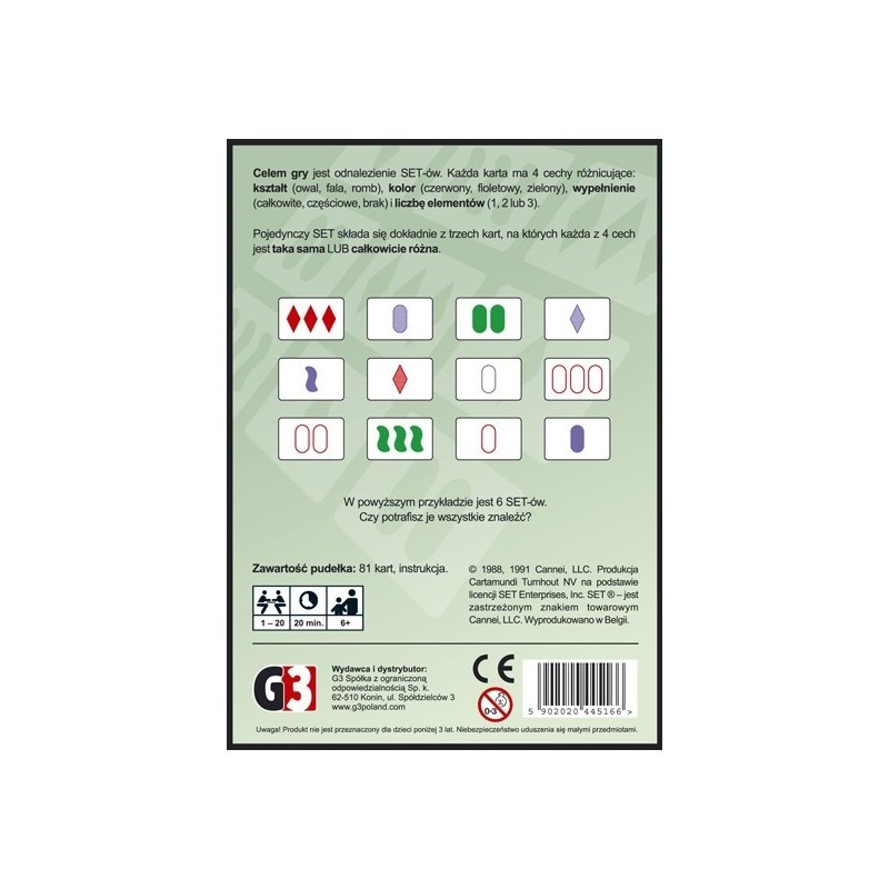 Pojedynczy SET składa się dokładnie z trzech kart, na których każda z 4 cech jest taka sama lub całkowicie różna. Gracz, który jako pierwszy odnajdzie SET-a w nagrodę otrzymuje 3 karty. Następnie pula jest ponownie uzupełniana do 12 kart.