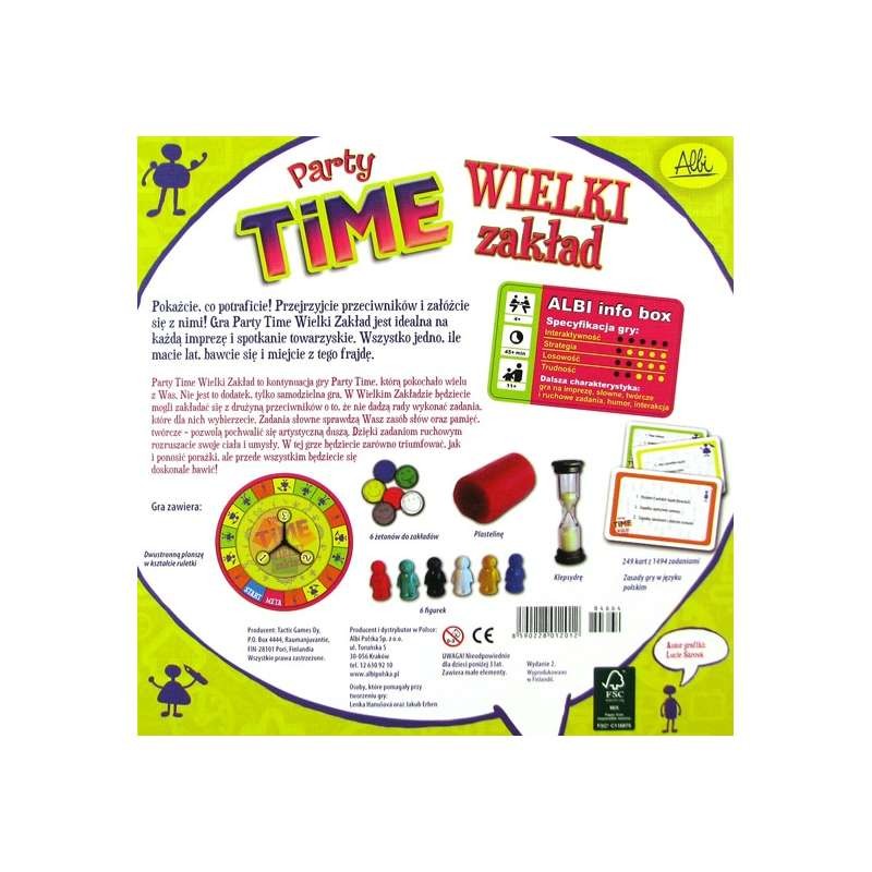 Party Time - Wielki Zakład to kontynuacja gry Party Alias, którą pokochało wielu z Was. Nie jest to dodatek, tylko samodzielna gra. W Wielkim Zakładzie będziecie mogli zakładać się z drużyną przeciwników o to, że nie dadzą rady wykonać zadania, które dla nich wybierzecie.