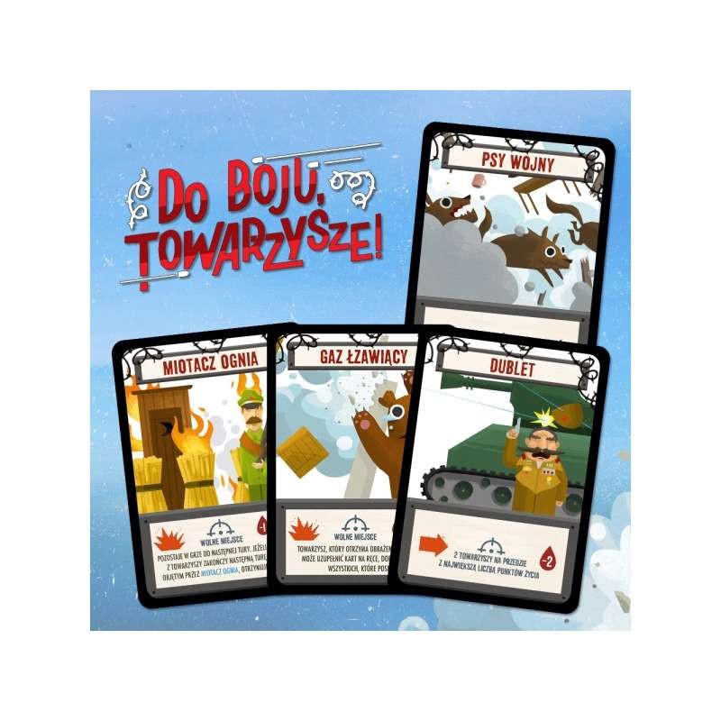 Zagrywaj karty Manewrów i Wydarzeń, by skryć się za plecami innych… ale najpierw musisz przewidzieć ich ruchy! Zbieraj Ekwipunek - Hełm, Kamizelka czy Maska Gazowa mogą uratować Cię przed stratą życia. Równoczesna, dynamiczna rozgrywka sprawi, że ani przez chwilę nie poczujesz się bezpiecznie! Pamiętaj, nie chcesz być na celowniku! Przeżyj, to rozkaz!