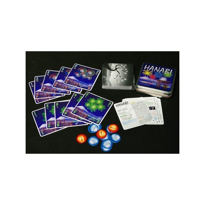 Hanabi to gra, w której gracze nie grają przeciw sobie, lecz współpracują aby osiągnąć wspólny cel. W tym przypadku wcielają się w rolę bezmyślnych właścicieli fabryk z fajerwerkami, którzy niechcący pomieszali prochy, lonty i rakiety na pokazie sztucznych ogni. Przedstawienie zaraz się zaczyna, a panika wdziera się w ich szeregi. Muszą działać razem aby pokaz nie zakończył się katastrofą! Pirotechnicy muszą złożyć 5 fajerwerków (1 biały, 1 czerwony, 1 niebieski, 1 żółty, 1 zielony) poprzez utworzenie z kart sekwensu rosnących liczb (1, 2, 3, 4, 5) w tym samym kolorze.