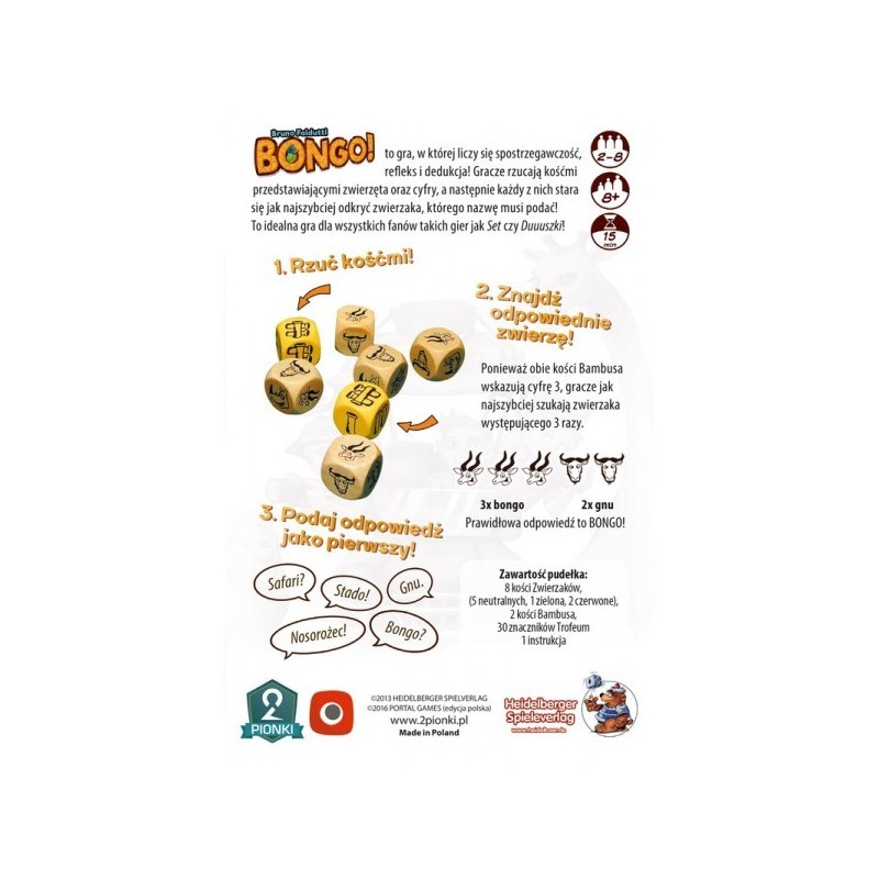 Bong to gra, w której liczy się spostrzegawczość, refleks i dedukcja! Gracze rzucają kośćmi przedstawiającymi zwierzęta oraz cyfry, a następnie każdy z nich stara się jak najszybciej odkryć zwierzaka, którego nazwę musi podać!