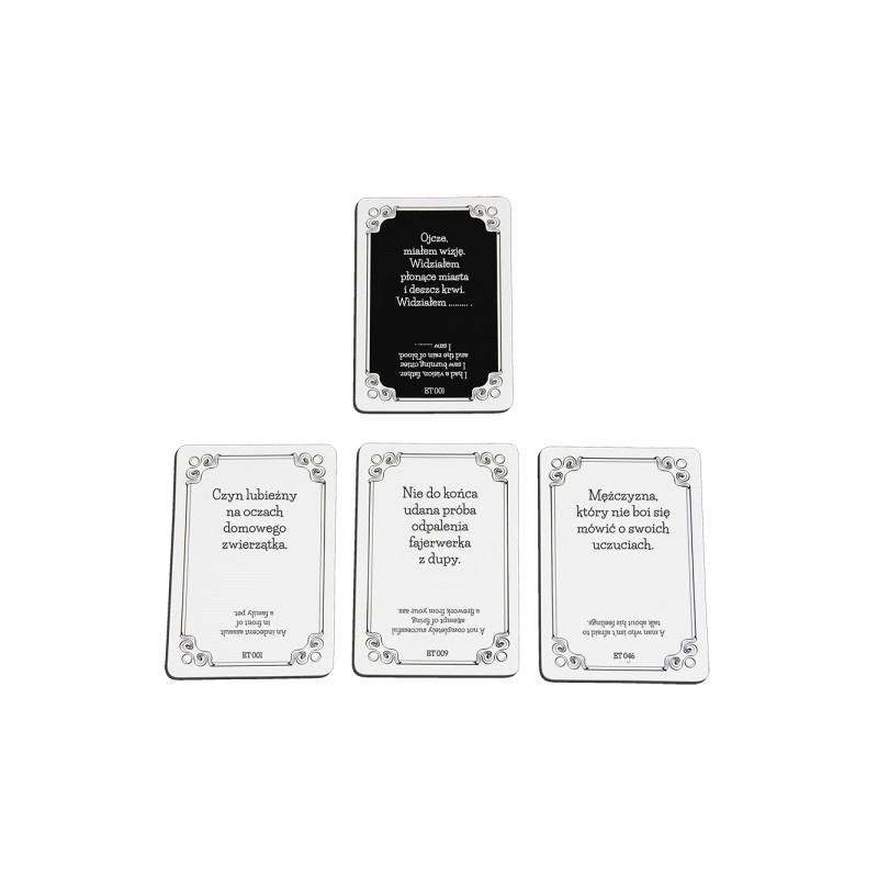 Jako jedyna na polskim rynku gra karciana zawiera anglojęzyczne odpowiedniki pytań i odpowiedzi, dzięki którym pokonuje bariery międzykulturowe i umożliwia zabawę na międzynarodowym poziomie.