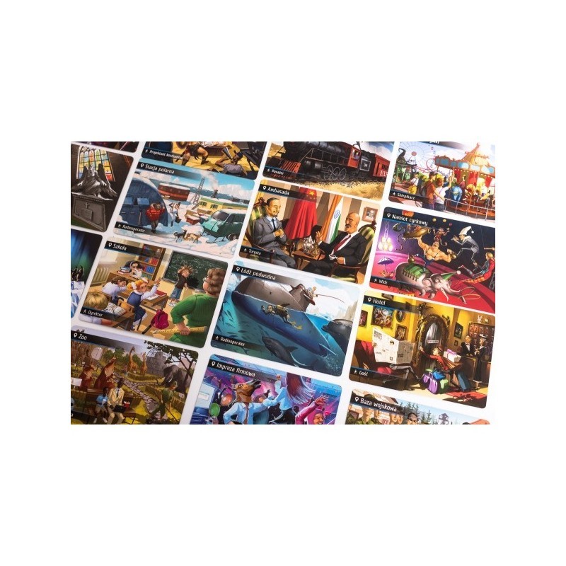 Przykład: Gracze mogą wylosować kartę "Zoo", a w zestawie kart jedna karta nie będzie miała ilustracji Zoo, tylko ilustrację Szpiega.