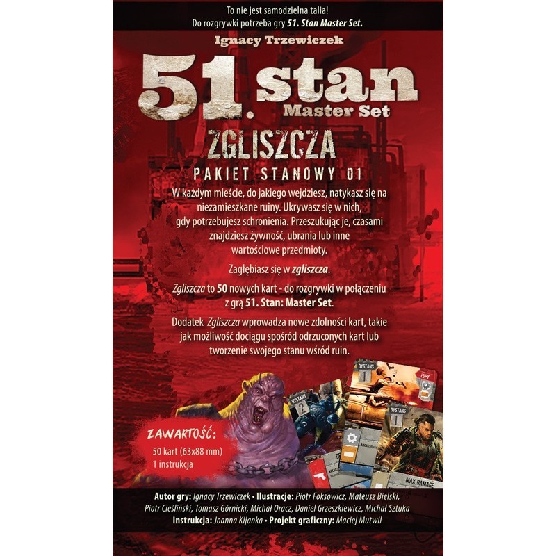 51. Stan: Zgliszcza to pierwsze rozszerzenie do gry 51 Stan: Master Set inspirowane starym dodatkiem o nazwie Ruiny wydanym w 2012. Nowy zestaw 50 kart z dodatku Zgliszcza, wprowadza ulubione karty z oryginalnego rozszerzenia, które dodają nową mechanikę do podstawowej wersji gry.