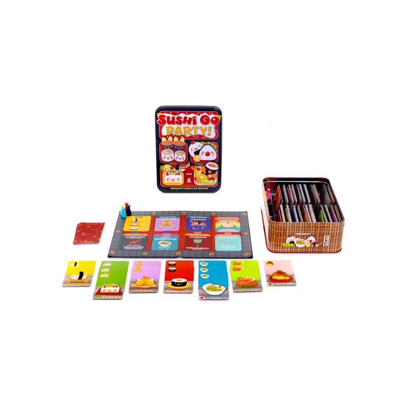 Sushi go party! to samodzielna wersja popularnej, imprezowej karcianki, oparta o znaną z 7 cudów świata mechanikę draftu. Gracze dobierają na rękę tyle samo kart, po czym jedną z nich wybierają, a resztę przekazują dalej. W ten sposób konstruujemy jak najbardziej opłacalne zestawy, kontrolując jednocześnie poczynania przeciwników.