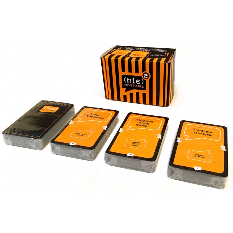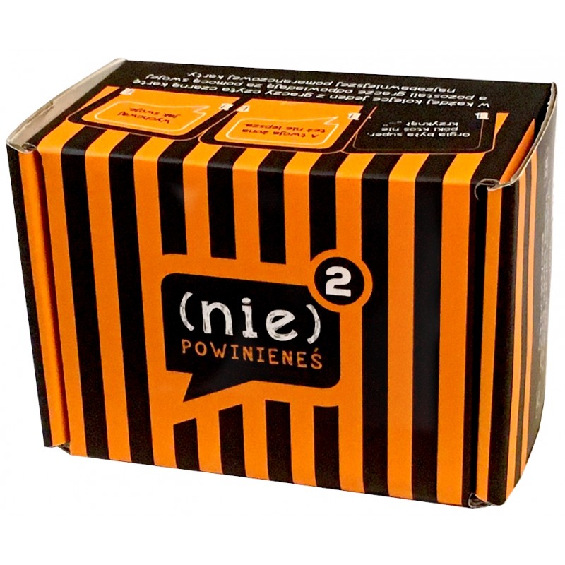 Autorzy Kart Dżentelmenów przedstawiają (Nie)Powinieneś 2 - imprezowa gra karciana dla okropnych ludzi, którzy lubią się śmiać bez zahamowań! W każdej kolejce jeden z graczy czyta pytanie z czarnej karty a pozostali gracze odpowiadają za pomocą najzabawniejszej pomarańczowej karty.