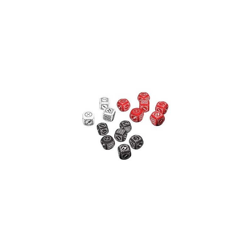 W pudełku znajdziesz dwa zestawy po 6 kości - czarny oraz czerwony - a także 3 białe kości dodatkowe.