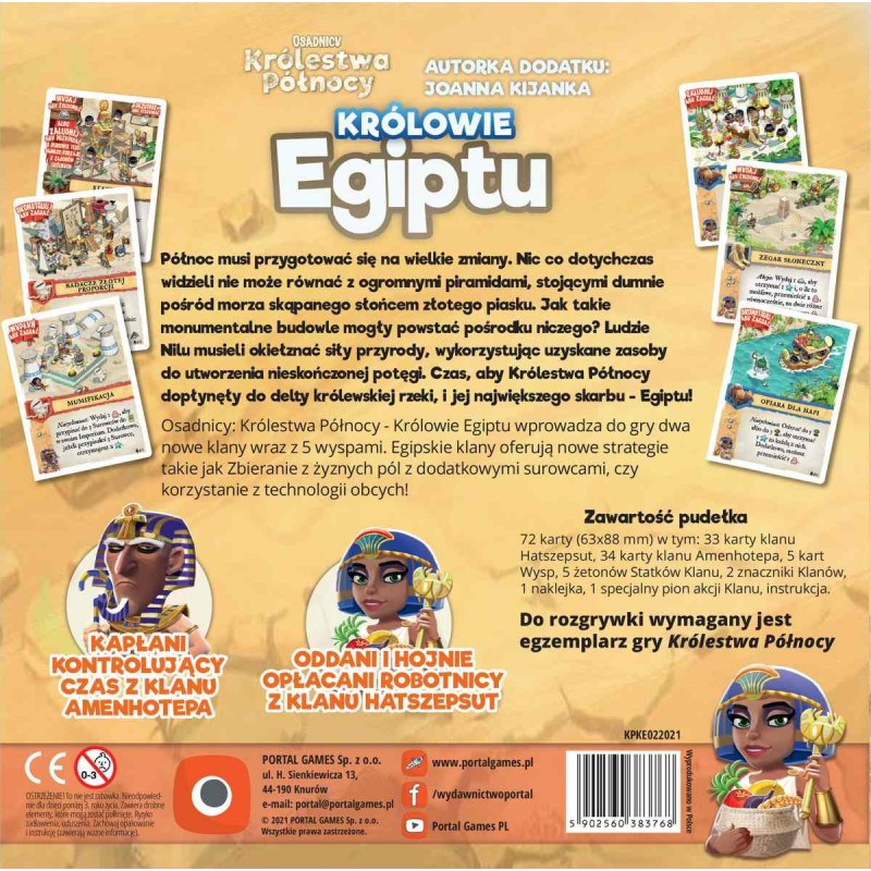 Egipcjanie wsiadają na okręty i ruszają podbijać nowe lądy! Kto okaże się lepszy w tym starciu? Dzielny faraon Amenhotep? A może mądra królowa Hatszepsut? Osadnicy: Królestwa północy - Królowie Egiptu to dodatek, w którym Joanna Kijanka zabiera nas do kraju nad Nilem. Opowiedz się po jednej ze stron i poprowadź swoje imperium do zwycięstwa!