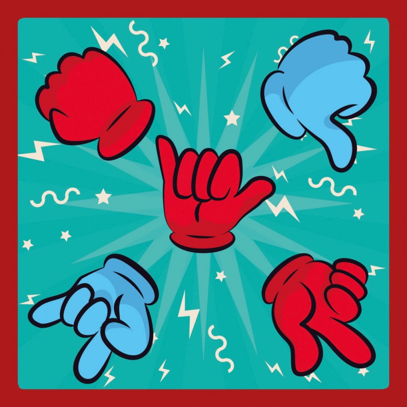 - Koordynacja - na karcie znajdują się rysunki dłoni w 2 kolorach (niebieski dla lewe ręki i czerwony dla prawej). Zakryj kartę dłonią odpowiadającą kolorowi rysunku. Rysunek ten przedstawia 1 z 3 gestów: papier, kamień albo nożyce. Po zakryciu karty drugą dłonią pokaż gest, który pozwoli Ci pokonać ten znajdujący się na karcie.