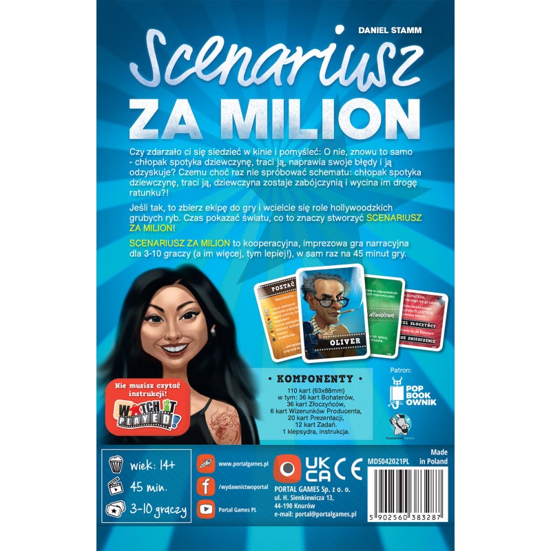Scenariusz za milion to imprezowa gra karciana dla 3 do aż 10 osób, która przeniesie nas do Hollywood! Jeden z graczy wcieli się w filmowego producenta, a pozostali podzielą na dwie grupy scenarzystów, rywalizujących ze sobą o prawo do nakręcenia kasowego blockbustera.