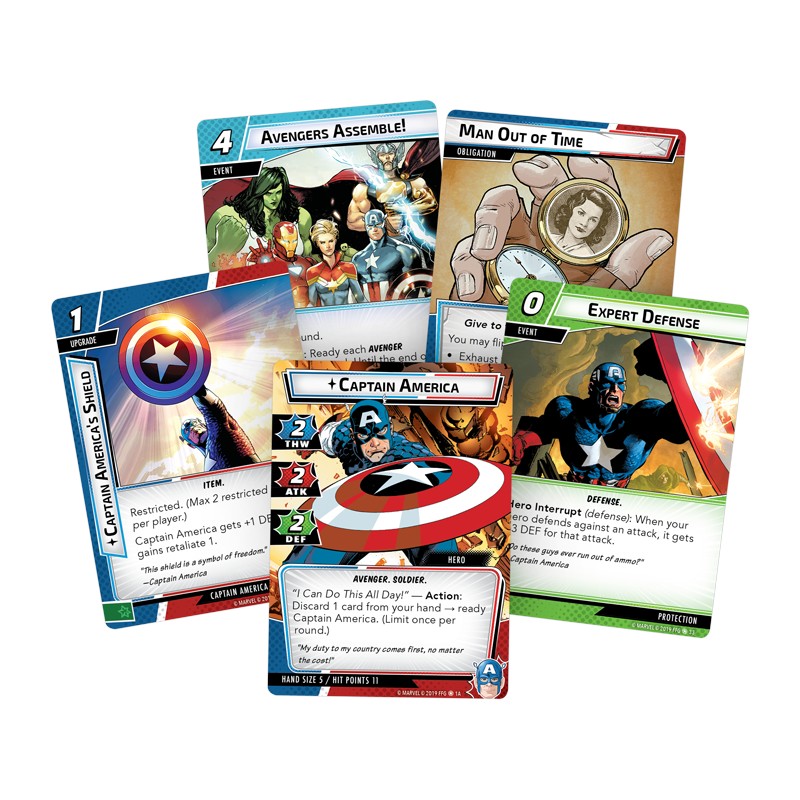Jak pozostałe zestawy bohaterów, Marvel Champions: Captain America Hero Pack zawiera gotową do gry talię, która zawiera karty bohatera oraz karty dodatkowe.