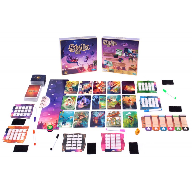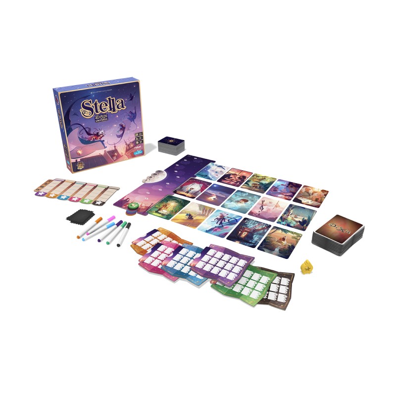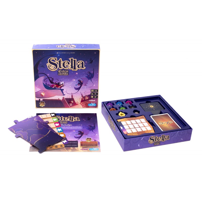 - Stella należy do Uniwersum Dixita, a zawarte w niej karty mogą służyć do gry w Dixit i odwrotnie! Gra zawiera pełną talię 84 kart w identycznym formacie, z tym samym tyłem, co wszystkie tytuły z serii Dixit.