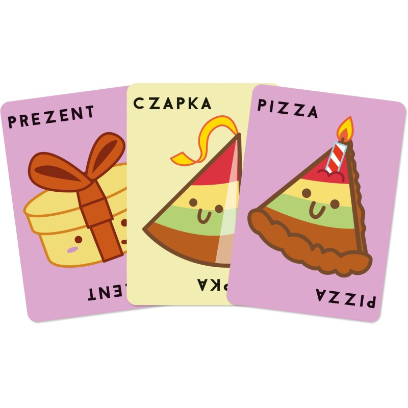 Buła, Pizza, Czapka, Prezent, Tort! Wykładaj karty w rytm tej niecodziennej wyliczanki, a gdy wypowiedziane słowo pasuje do obrazka, klepnij kartę ręką, nakrywając ją. Ten, kto będzie ostatni, zabiera wszystkie karty, a zwycięży gracz, który pozbył się wszystkich!