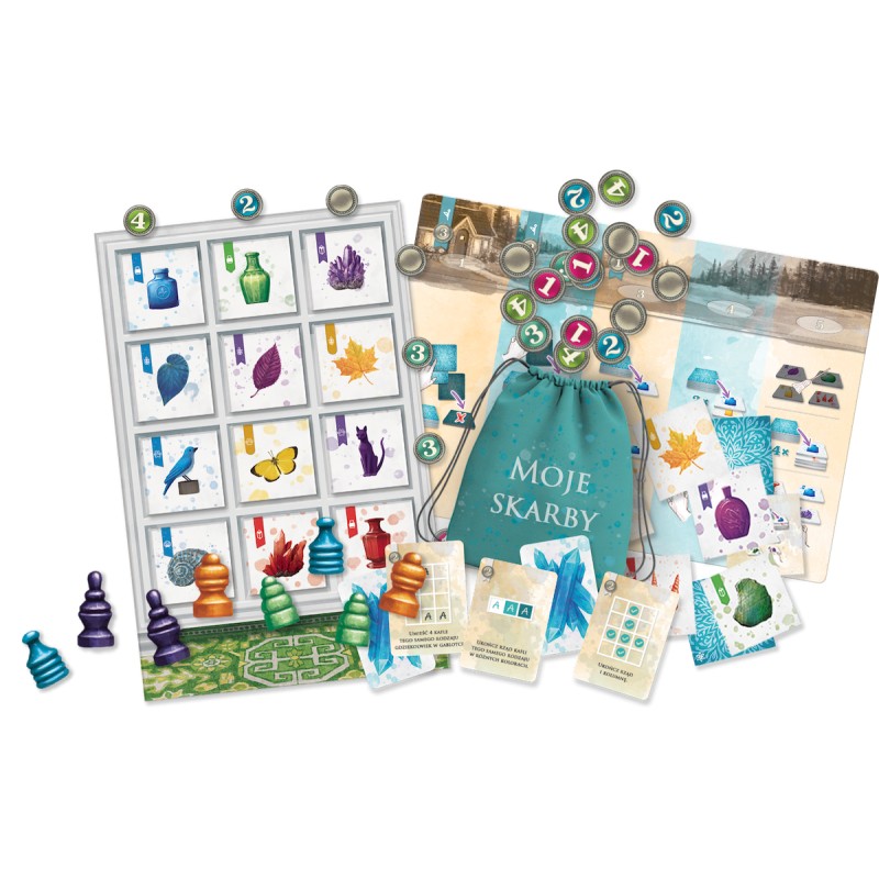 Moje skarby to gra strategiczna, w której staramy się wypełnić nasze gablotki jak najbardziej opłacalnym zestawem kafelków. W każdej rundzie wyruszymy w podróż, z której przyniesiemy nowe skarby, a dla zwycięstwa kluczowe będzie odpowiednie umieszczanie ich w rzędach i kolumnach naszego regału.