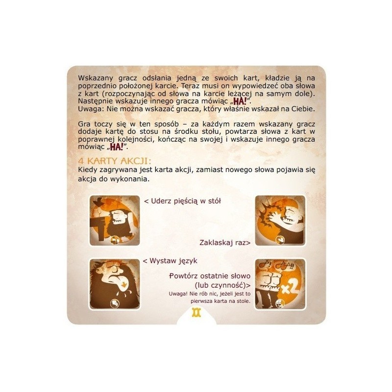Oprócz sylab w grze występują specjalne gesty. Wystawiony język, uderzenie ręką o stół, klaskanie – to może skutecznie wybić z rytmu wszystkich zgromadzonych przy ognisku!