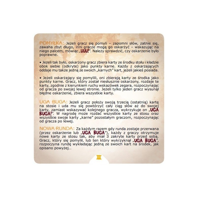 Za pomocą kart, na których zawarto sylaby składamy pełne zdania starając się zapamiętać, jakich słów użyli przeciwnicy. Zadanie nie jest łatwe, gdyż nie widać jakie karty zostały użyte wcześniej i cały ciąg sylab trzeba zapamiętać: