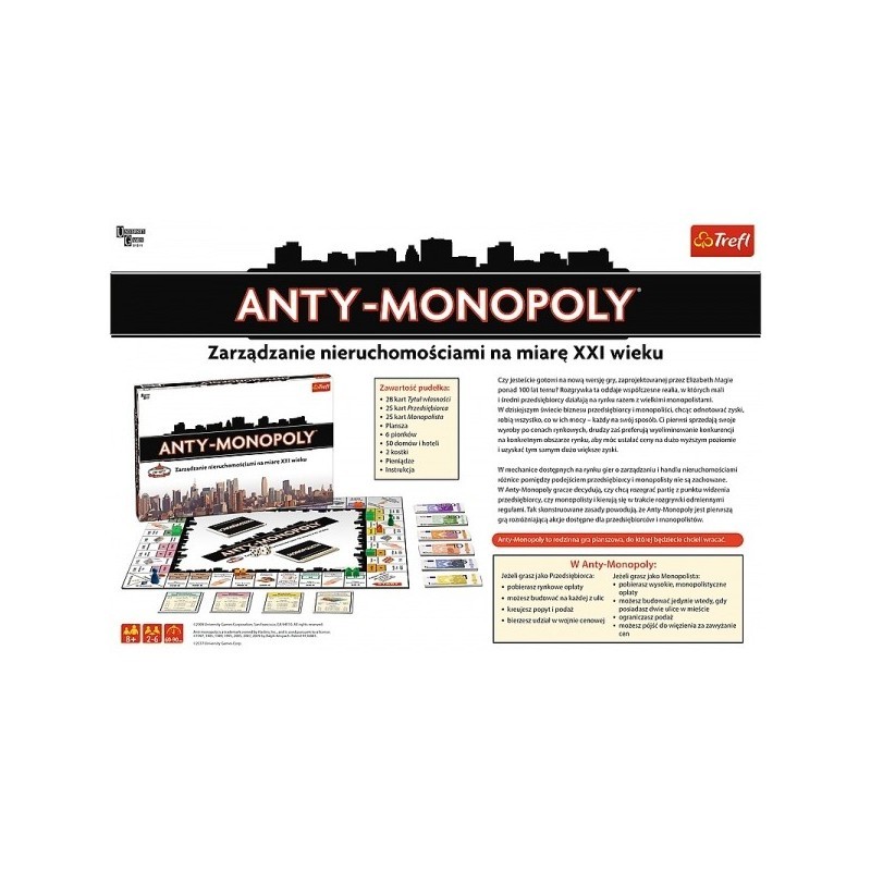 Czy jesteście gotowi na nową wersję klasycznej gry rodzinnej? Rozgrywka w Anty-Monopoly oddaje współczesne realia, w których mali i średni przedsiębiorcy działają na rynku razem z wielkimi monopolistami. Tu sami decydujecie, czy chcecie rozegrać partię z punktu widzenia przedsiębiorcy, czy monopolisty, dzięki czemu w trakcie rozgrywki kierować się będziecie odmiennymi regułami.