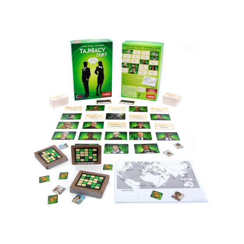 Tajniacy: Duet to kooperacyjna gra słowna dla 2 lub więcej graczy. Na karcie klucza znajduje się 12 pól – 9 pól oznacza słowa, które musi odgadnąć drugi tajniak, a 3 to słowa, których musi się wystrzegać. Aby naprowadzić swojego partnera na konkretne słowa (bądź słowo), dajesz mu jednowyrazowe wskazówki. Z kolei Twój partner daje Ci wskazówki do słów, które musisz odgadnąć. Jeśli obydwoje odgadniecie wszystkie słowa, nim wykorzystacie wszystkie swoje tury, wygrywacie i możecie razem świętować zwycięstwo! Hasła są wieloznaczne, skojarzenia również – owocuje to rozgrywką pełną śmiechu i emocji.