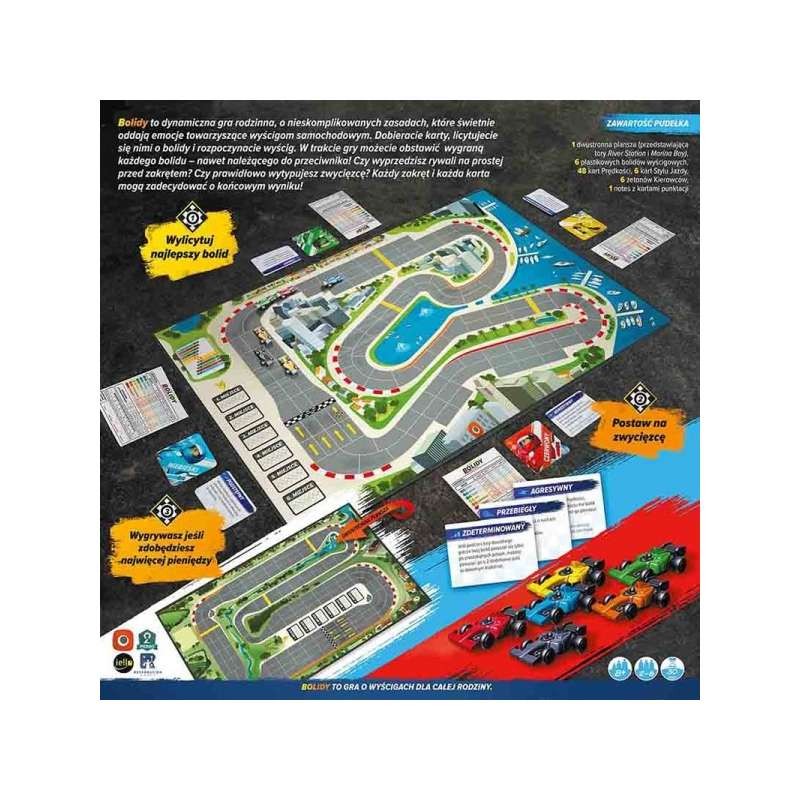 Bolidy to dynamiczna gra rodzinna, o nieskomplikowanych zasadach, które świetnie oddają emocje towarzyszące wyścigom samochodowym. Dobieracie karty, licytujecie się nimi o bolidy i rozpoczynacie wyścig.