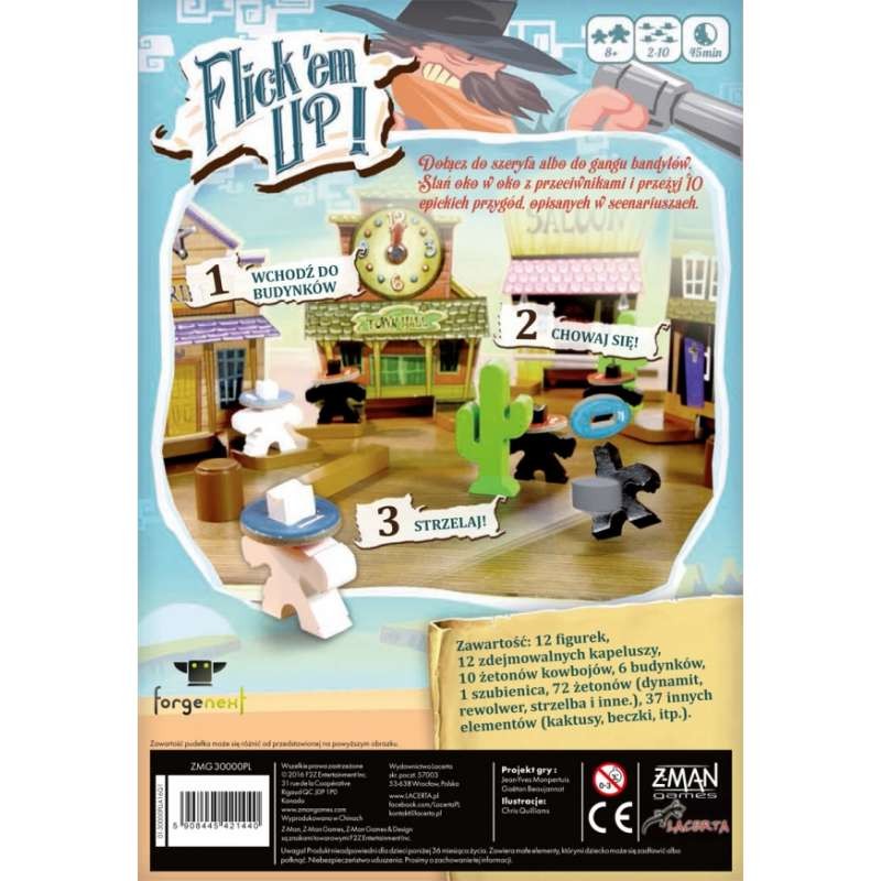 Witaj w ekscytującym świecie „Flick ‘em Up! - Dzika Strzelanka”. Dzięki wciągającym scenariuszom i wyjątkowym elementom krajobrazu przekształcisz swój stół kuchenny albo podłogę w salonie w małe, aczkolwiek bezwzględnie rządzone, miasteczko na dzikim zachodzie. Nabij kule w swojego Colta, ukryj się i strzelaj. Jeśli zakładasz, że twoi wrogowie okażą ci litość, to jesteś głupcem.