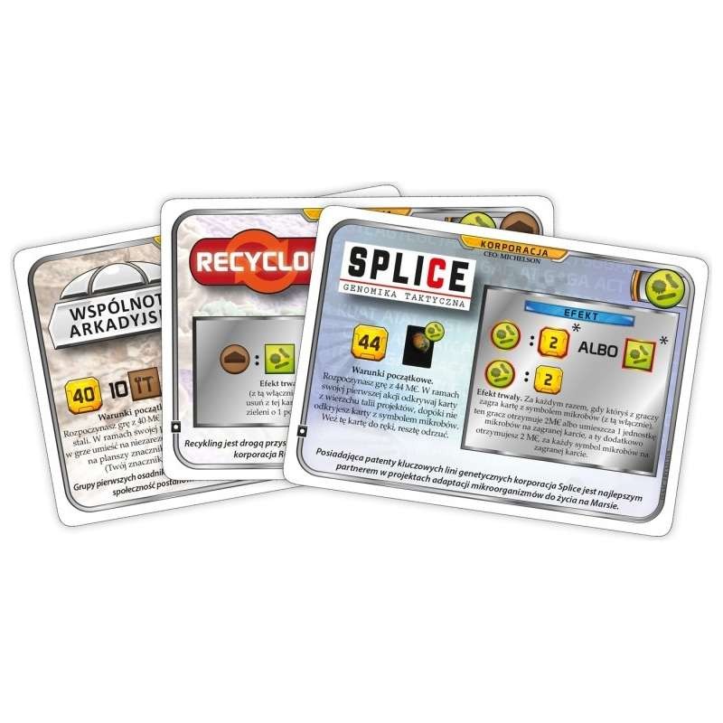 Grając korporacją Splice rozpoczynamy grę z dodatkową kartą, posiadającą symbol mikrobów. To doskonale łączy się z jej efektem trwałym, który wyjątkowo wpływa na wszystkich graczy przy stole. Gdy którykolwiek z graczy zagra kartę z symbolem mikrobów, otrzymuje dodatkowy bonus, jednocześnie wzmacniając korporacje Splice dodatkowymi megakredytami.