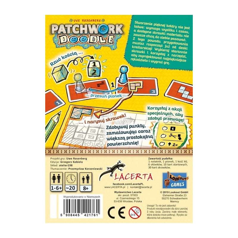 W grze Patchwork Doodle jej autor, Uwe Rosenberg, zaprasza nas do zupełnie nowej zabawy, bazującej na podstawowej grze Patchwork. Tym razem nie będziemy układać żetonów na planszy. Będziemy je rysować!
