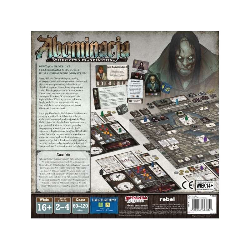 Abominacja: Dziedzictwo Frankensteina to gra strategiczna o tworzeniu własnych kreatur, zainspirowana gotyckim horrorem Mary Shelley. Podczas zabawy 2-4 graczy wciela się w naukowców, którzy dołożą wszelkich starań, by zwyciężyć w wyścigu o stworzenie nowego Frankensteina. Monstrum potrzebuje Waszej pomocy, by zrobić to, czego nie zdążył dokonać jej twórca: ożywić kreaturę podobną do niej; towarzysza, który rozjaśni mroki samotności.