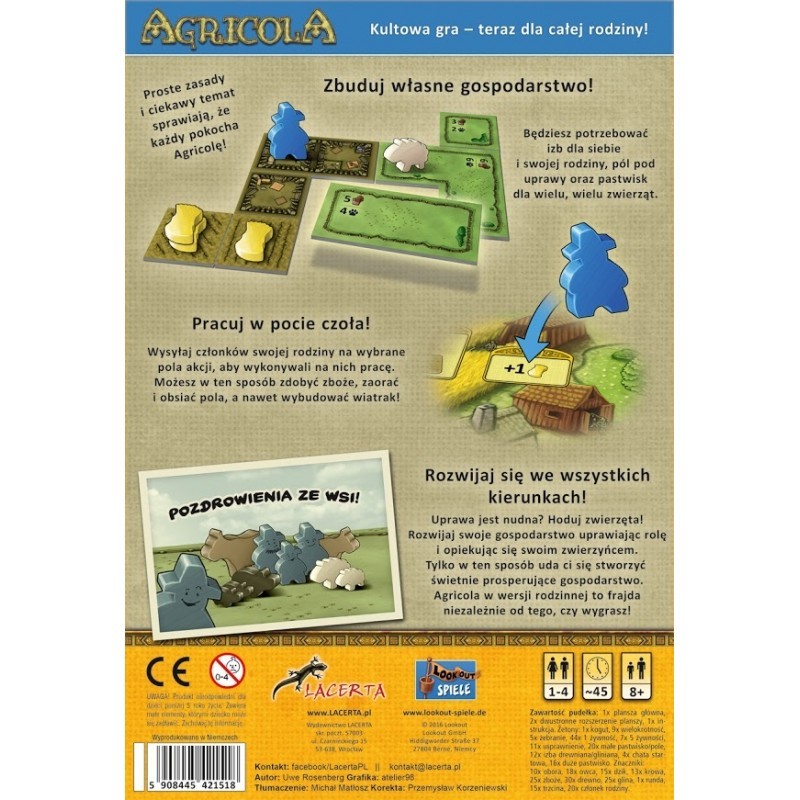 Agricola (wersja rodzinna) stwarza niepowtarzalną okazję, by wprowadzić młodych graczy w świat ekscytujących gier ekonomicznych zaprojektowanych przez Uwe Rosenberga. Stworzona z myślą o rozgrywkach dla jednej do czterech osób, otrzymała nowe, usprawnione zasady, umożliwiające bardziej beztroską i relaksującą rozgrywkę.