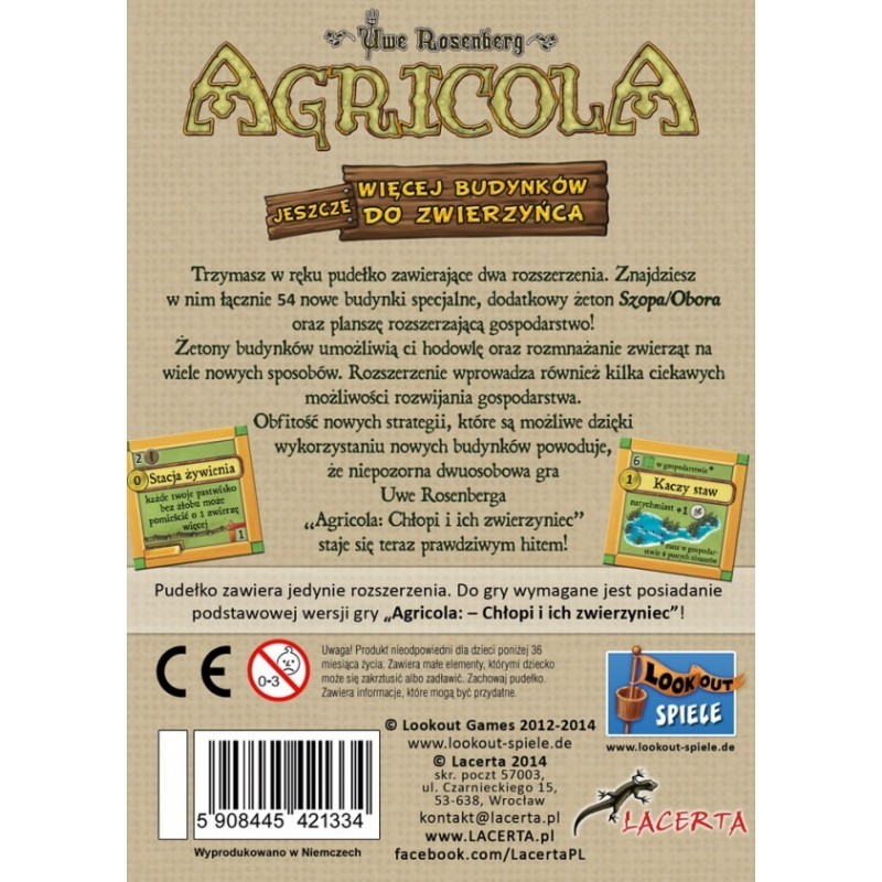 Jeszcze więcej budynków do zwierzyńca to dwa dodatki gry Agricola: chłopi i ich zwierzyniec. Wprowadzają one do gry 54 nowe budynki specjalne, dzięki którym gra staje się jeszcze bardziej strategiczna.