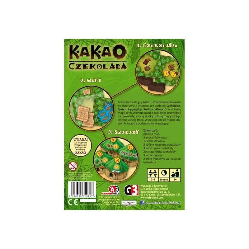 Rozszerzenie do gry Kakao - Czekolada wprowadza do rozgrywki cztery pomniejsze dodatki: Czekoladę, System irygacyjny, Szałasy i Mapy.