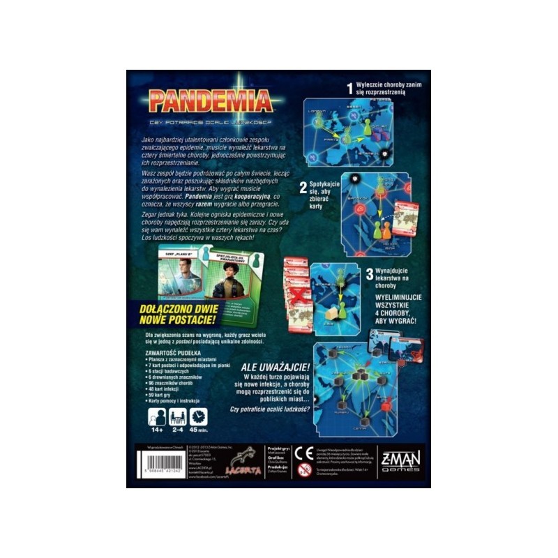 Gracze muszą współpracować ze sobą, wykorzystując silne strony swych postaci i dobrze planować strategię, jaką wykorzystają, by pozbyć się chorób, zanim w serii coraz gwałtowniejszych epidemii opanują one cały świat. Na przykład Specjalista Operacyjny potrafi budować laboratoria badawcze, potrzebne do tego, by wynajdywać szczepionki na choroby. Naukowiec potrzebuje tylko 4 kart konkretnej choroby, by ją wyleczyć, zamiast zwyczajowych 5.