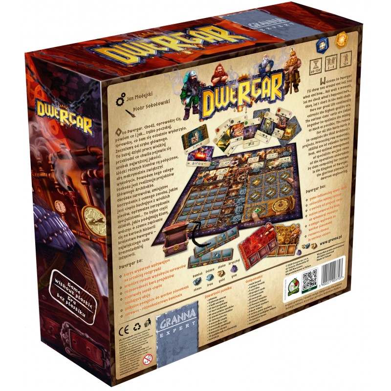 Jesteś przywódcą gildii krasnoludów, która pracuje w legendarnej kopalni Dwergar. Twoim zadaniem jest zdobycie wszelkiego rodzaju zasobów (kamieni, żelaza, złota, klejnotów, ciepła). Używaj ich, aby rozwijać infrastrukturę kopalni, wypełniając karty ze zalecaniami architektów. Korzystając z wydobytych zasobów realizujesz karty zleceń, otrzymując w zamian punkty zwycięstwa. Głębia rozgrywki oraz intuicyjne zasady zadowolą nawet wytrawnych graczy. Karty wydarzeń, zmienna dostępność fachowców oraz 5 różnych tali zleceń architektów gwarantują różnorodność każdej rozgrywki.