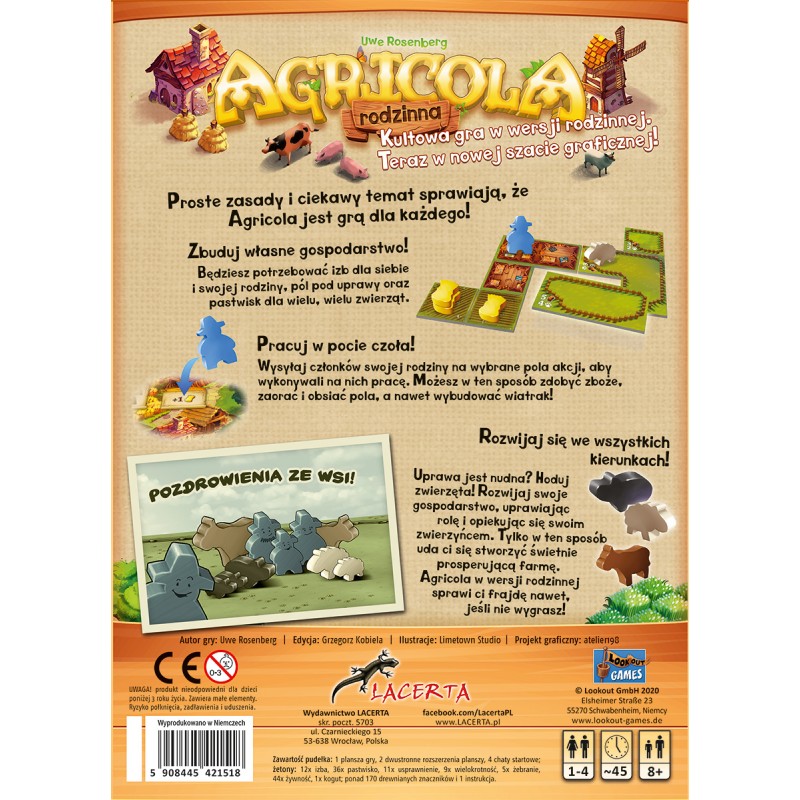 Agricola to kultowa gra, w wersji dla całej rodzinny. Zbuduj własne gospodarstwo: będziesz potrzebować izb dla siebie i swojej rodziny, pól pod uprawy oraz pastwisk dla wielu, wielu zwierząt. Pracuj w pocie czoła: wysyłaj członków swojej rodziny na wybrane pola akcji, aby wykonywali na nich pracę. Możesz w ten sposób zdobyć zboże, zaorać i obsiać pola, a nawet wybudować wiatrak. Rozwijaj się we wszystkich kierunkach: uprawa jest nudna? Hoduj zwierzęta! Rozwijaj swoje gospodarstwo uprawiając rolę i opiekując się swoim zwierzyńcem. Tylko w ten sposób uda Ci się stworzyć świetnie prosperujące gospodarstwo. Agricola w wersji rodzinnej to frajda niezależnie od tego, czy wygrasz!