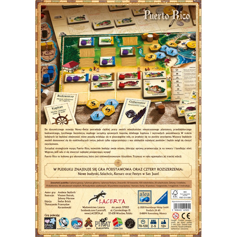 Celem gry Puerto Rico jest zdobycie największej liczby punktów zwycięstwa, zarządzając idylliczną wyspą. Wszyscy będziecie kolejno wykonywać akcje, wcielając się w różne postacie. W każdej rundzie wszyscy będziecie mogli skorzystać z akcji wybranych postaci, jednak tylko osoba, która wybrała daną postać może skorzystać z jej przywileju. Bądźcie jednak uważni, ponieważ niektóre decyzje mogą okazać się bardziej korzystne dla przeciwników niż dla Was. Starajcie się utrzymać przewagę nad rywalami, dostosowując się do ciągle zmieniających się warunków.