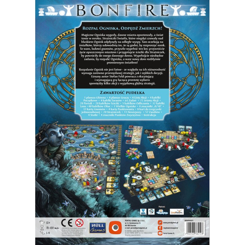 Bonfire to strategiczna gra planszowa dla 1-4 graczy, autorstwa wybitnego Stefana Felda. To zaawansowana euro gra z wciągającym trybem solo, różnymi drogami do zwycięstwa oraz wieloma przeplatającymi się mechanikami - wyboru akcji, zarządzania surowcami, układania kafelków, ruchu po planszy, zbierania setów. Piękna grafika Dennisa Lohausena (Terra Mystica, Uczta dla Odyna) przenosi graczy do fantastycznego świata gnomów starających się rozpalić mistyczne ogniska.
