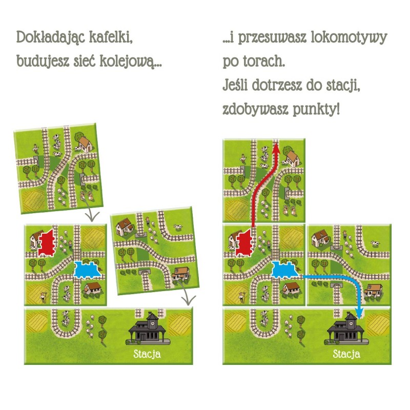 Za pomocą kafelków budujesz sieć torów, po której jeżdżą twoje lokomotywy. Każda z nich musi dotrzeć do innego miasta. Im szybciej tam dotrze, tym więcej punktów zdobędziesz. Obserwuj lokomotywy innych graczy i pilnuj, aby nie dojechały do stacji przed tobą!
