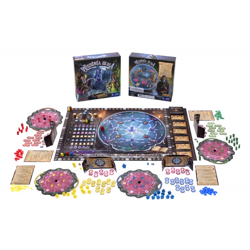 Wiedźmia Skała to gra planszowa, w której wcielacie się w uczonych mistrzów gildii zebranych wokół pradawnego świętego kamienia. Każda osoba zajmuje 1 z 4 wież i stamtąd rozpoczyna grę.