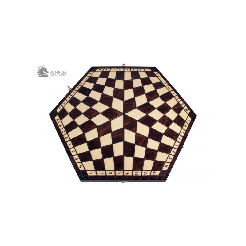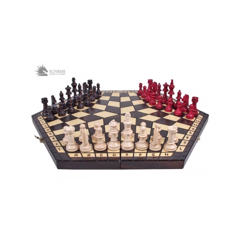 Unikalne szachy dla trzech graczy. Pomimo ich dużych rozmiarów, gra się nimi wygodnie. Składana szachownica jest dostępna w standardowym (brązowym) kolorze i innych kolorach na zamówienie.