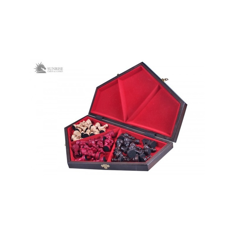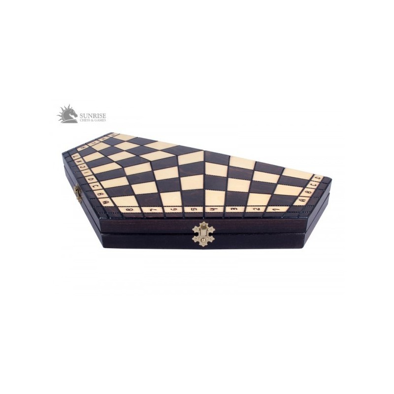 Unikalne szachy dla trzech graczy. Pomimo ich dużych rozmiarów, gra się nimi wygodnie. Składana szachownica jest dostępna w standardowym (brązowym) kolorze i innych kolorach na zamówienie. Komplet ma trzy komory wykończone od wewnątrz filcową wkładką na figury. Figury szachowe są wykonane z grabowego i bukowego drewna. Ulotka z zasadami gry została dołączona do każdej kasetki.