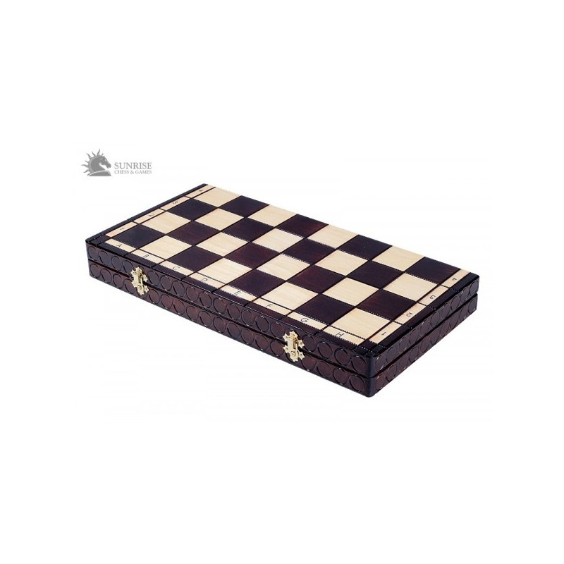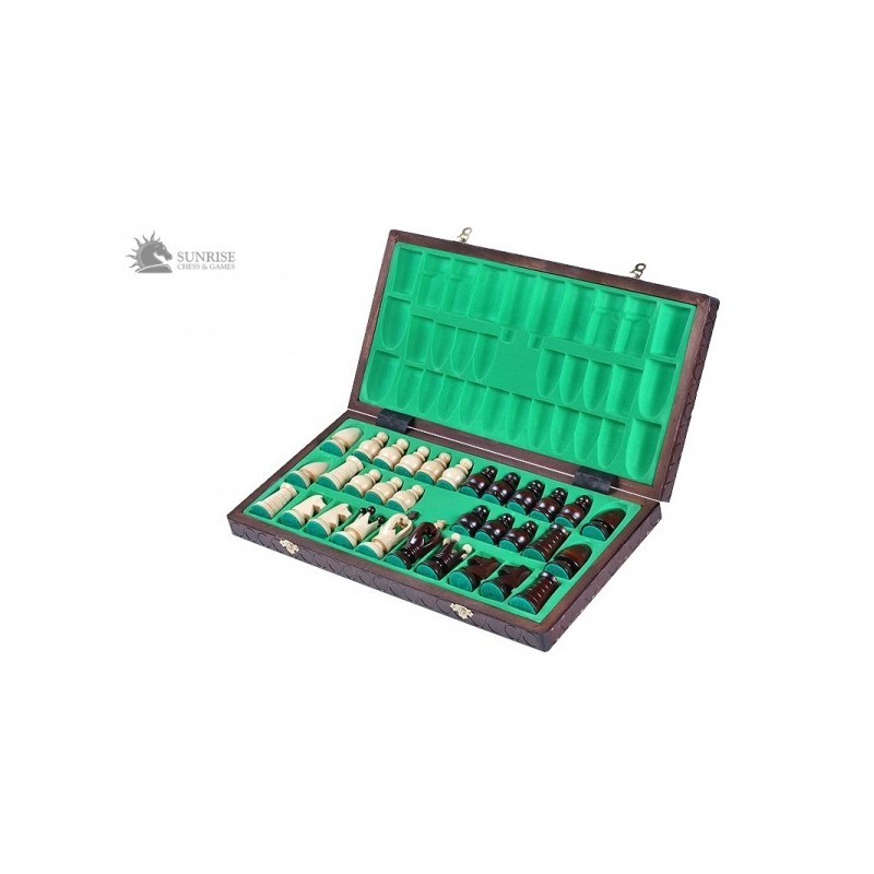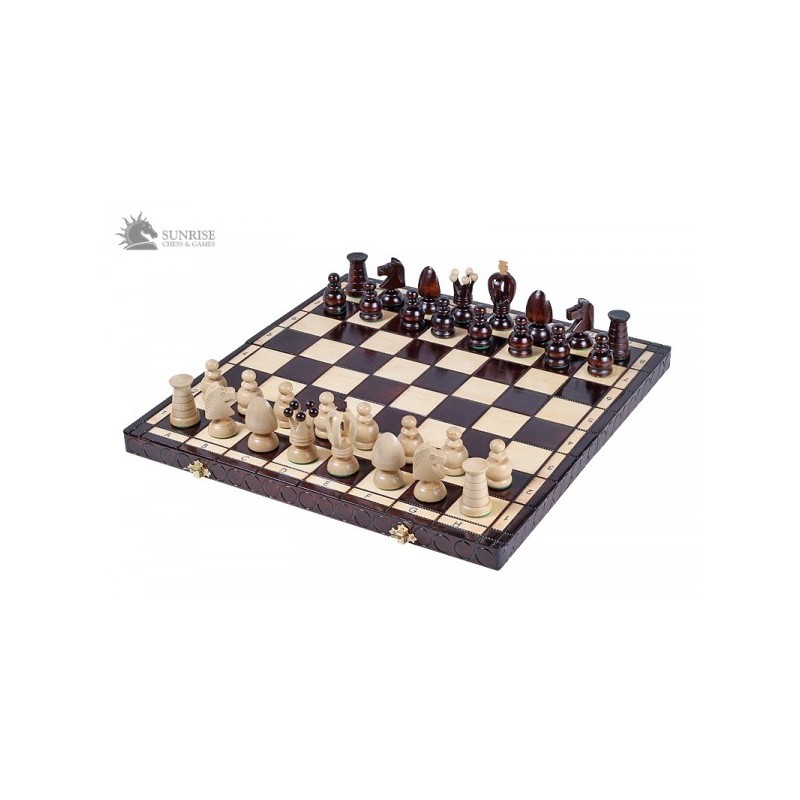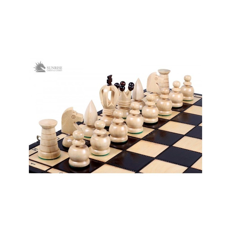 Jest to największy komplet z naszej serii szachów królewskich i jednocześnie jeden z najbardziej popularnych kompletów amatorskich. Wyposażono go we wkładkę na figury szachowe. Figury wykonane są z drewna grabowego.