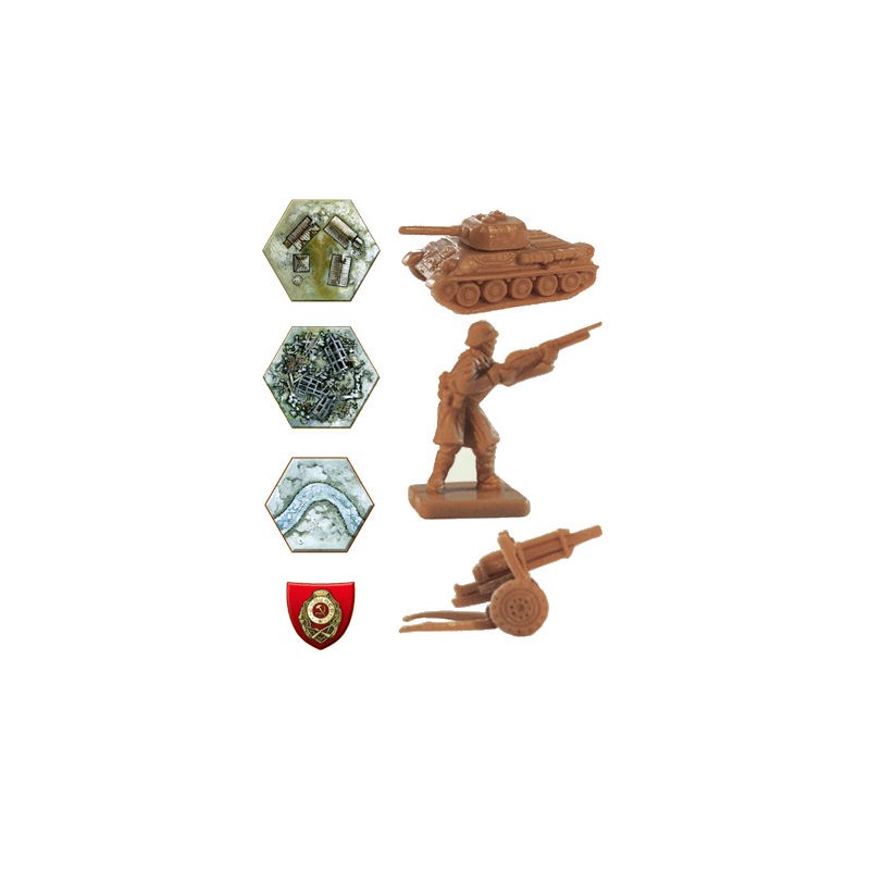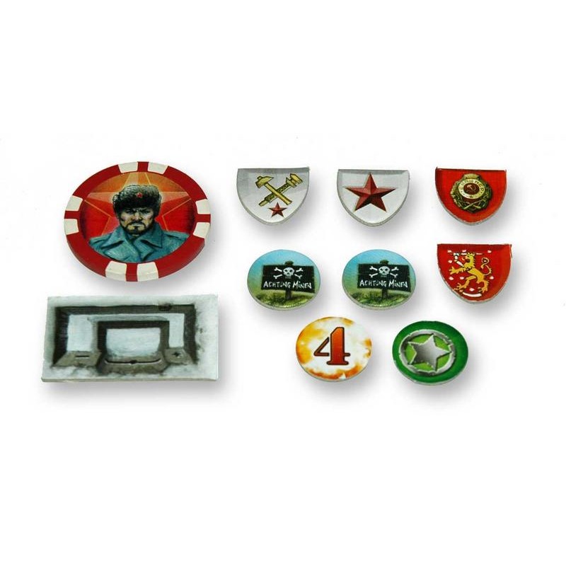 - 44 dwustronnych żetonów terenu, w tym ruiny, wąwozy, zamarznięte rzeki, bagna i pokryte śniegiem lasy